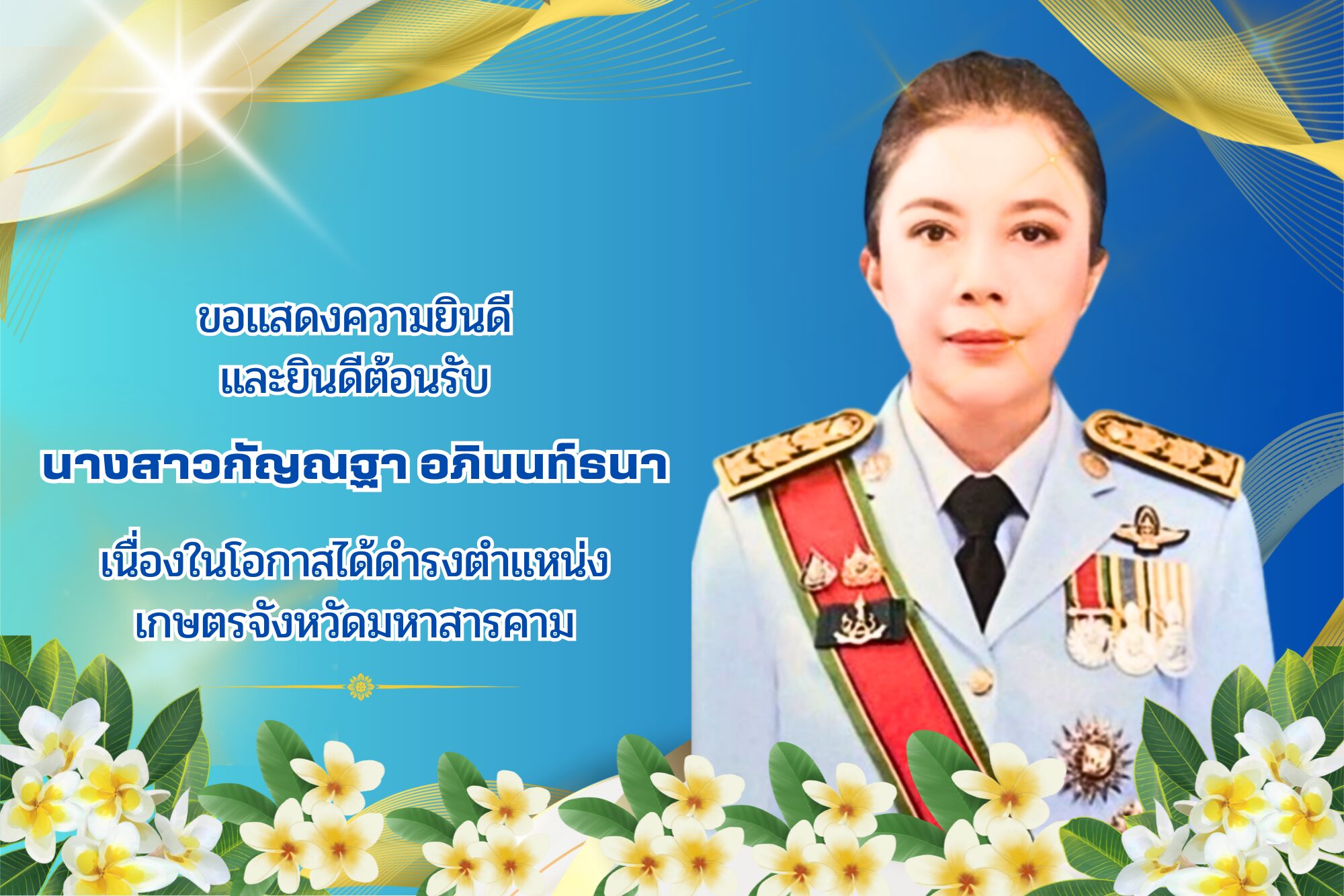 นางสาวกัญณฐา อภินนท์ธนา ผู้ดำรงตำแหน่งเกษตรจังหวัดมหาสารคาม (ปัจจุบัน) ณ สำนักงานเกษตรจังหวัดมหาสารคาม อำเภอเมืองมหาสารคาม จังหวัดมหาสารคาม