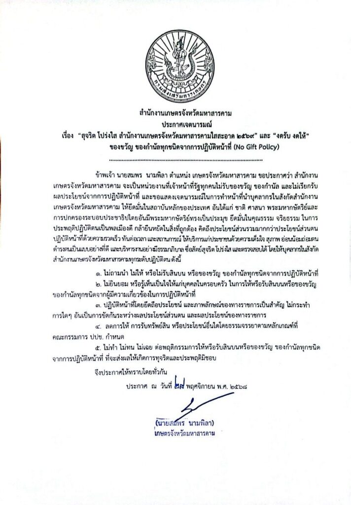 สำนักงานเกษตรจังหวัดมหาสารคาม ประกาศเจตนารมณ์ เรื่อง “สุจริต โปร่งใส สำนักงานเกษตรจังหวัดมหาสารคามใสสะอาด 2569” และ “งดรับ งดให้” ของขวัญ ของกำนัลทุกชนิดจากการปฏิบัติหน้าที่ (No Gift Policy)