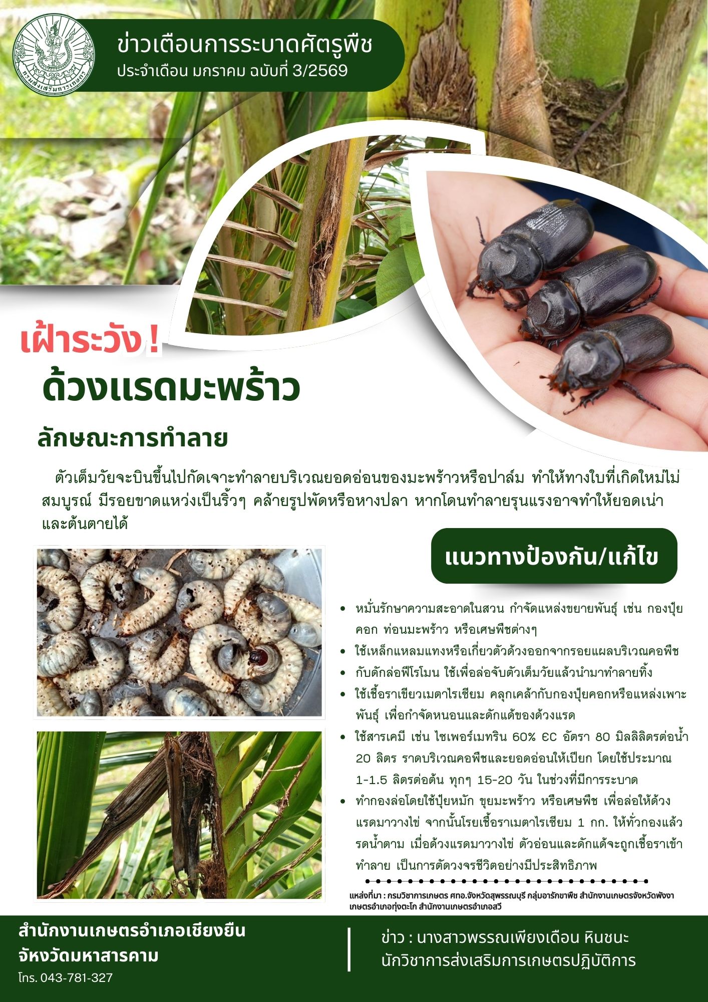 ตัวเต็มวัยจะบินขึ้นไปกัดเจาะทำลายบริเวณยอดอ่อนของมะพร้าวหรือปาล์ม