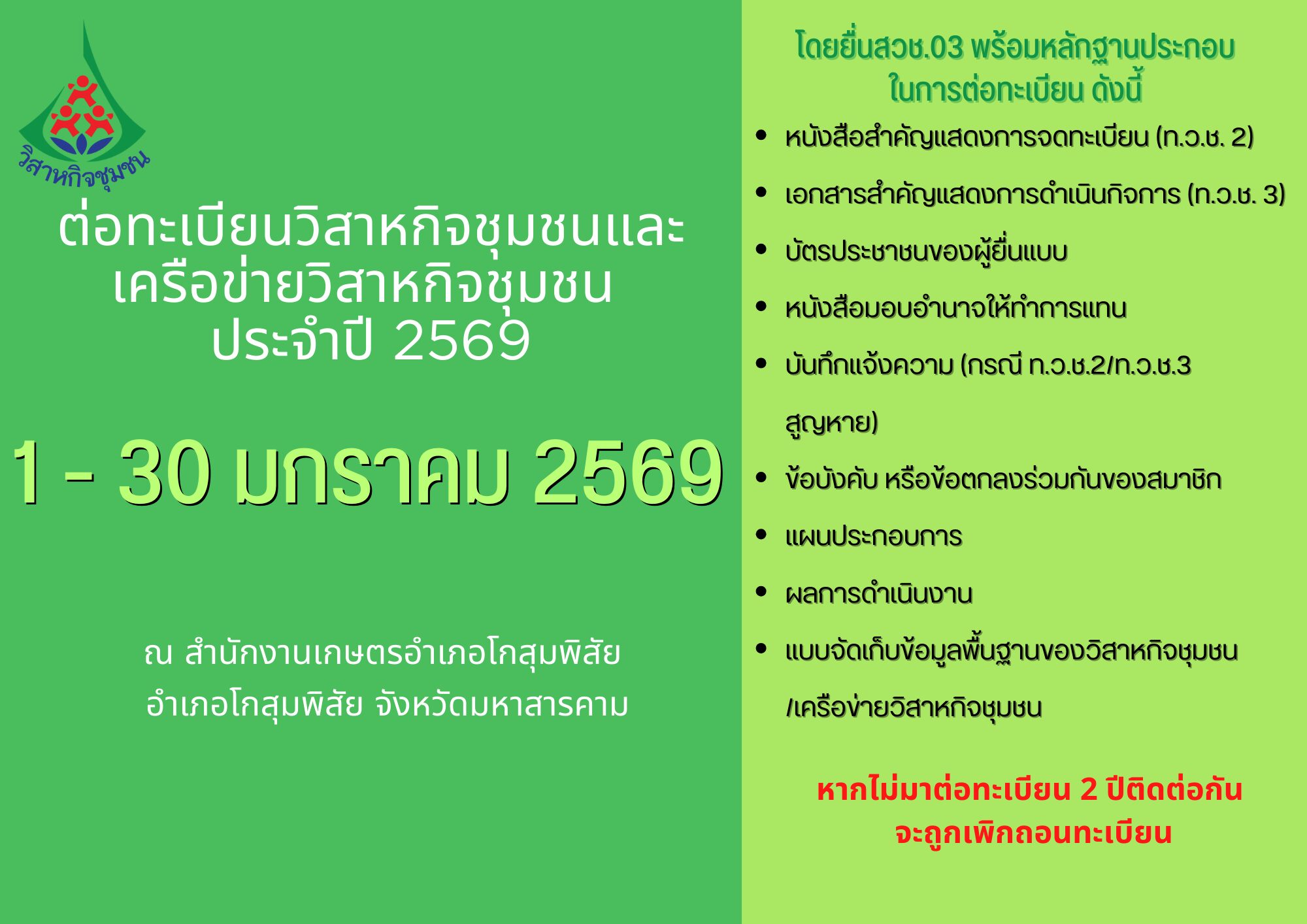 ประชาสัมพันธ์เชิญชวนกลุ่มวิสาหกิจชุมชนและเครือข่าย ฯ ต่อทะเบียนวิสาหกิจชุมชน ประจำปี 2569By kosumphisai_admin / 24 ธันวาคม 2025