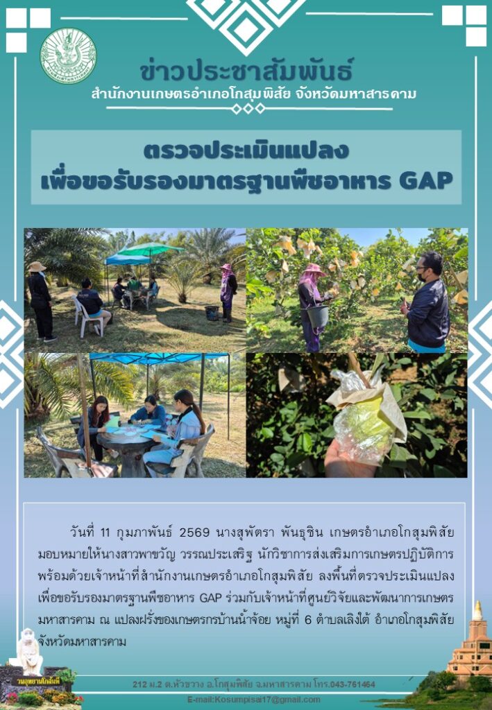 เกษตรอำเภอโกสุมพิสัย มอบหมาย น.ส.พาขวัญ (เกษตรมิ้ว) พร้อมด้วยเจ้าหน้าที่ตรวจประเมินแปลง เพื่อรับรองมาตรฐาน GAP ณ ตำบลเลิงใต้By kosumphisai_admin / 11 กุมภาพันธ์ 2026