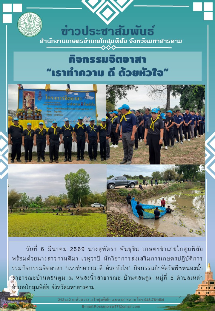 อำเภอโกสุมพิสัยจัดกิจกรรมจิตอาสา “เราทำความดี ด้วยหัวใจ” โดยมี นางสุพัตรา พันธุชิน เกษตรอำเภอโกสุมพิสัย และ น.ส. กานติมา (เกษตรหยก) เจ้าหน้าที่จาก สนง.เกษตรอำเภอโกสุมพิสัย ร่วมกิจกรรมฯBy kosumphisai_admin / 6 มีนาคม 2026