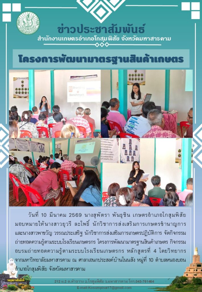 เกษตรอำเภอโกสุมพิสัย มอบหมาย น.ส.ยุวรี (เกษตรยุ) และ น.ส. พาขวัญ (เกษตรมิ้ว) จัดเวทีอบรมถ่ายทอดความรู้ตามระบบโรงเรียนเกษตรกร ภายใต้โครงการพัฒนามาตรฐานสินค้าเกษตร ปี 2569By kosumphisai_admin / 10 มีนาคม 2026