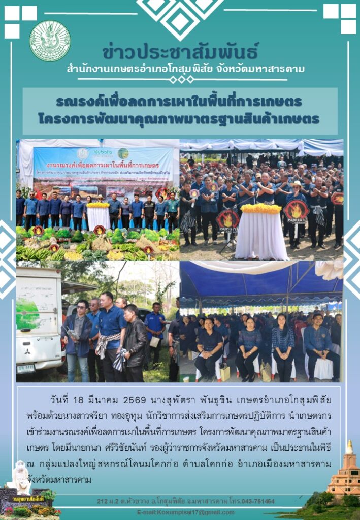 นายกนก ศรีวิชัยนันท์ รองผู้ว่าราชการจังหวัดมหาสารคาม เป็นประธานในพิธีเปิดงานรณรงค์เพื่อลดการเผาในพื้นที่การเกษตร ภายใต้โครงการพัฒนามาตรฐานสินค้าเกษตร ปี 2569 โดยมี นางสุพัตรา พันธุชิน เกษตรอำเภอโกสุมพิสัย พร้อมด้วย น.ส. จริยา ทองอุทุม เข้าร่วมกิจกรรม