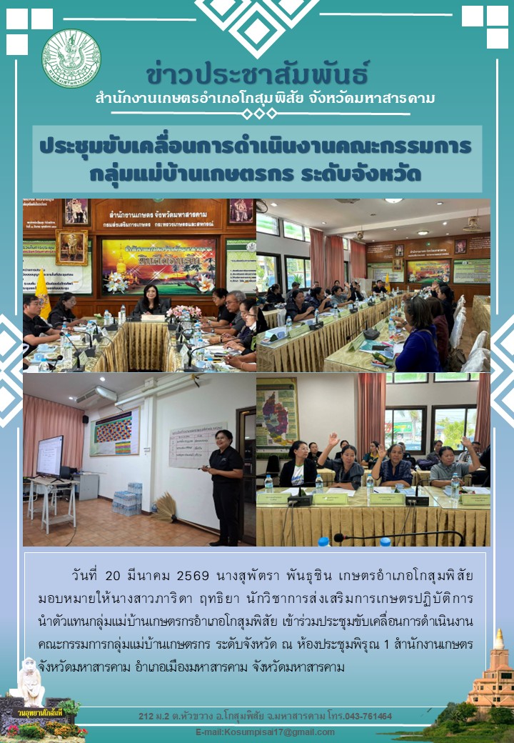 Previous นายกนก ศรีวิชัยนันท์ รองผู้ว่าราชการจังหวัดมหาสารคาม เป็นประธานในพิธีเปิดงานรณรงค์เพื่อลดการเผาในพื้นที่การเกษตร ภายใต้โครงการพัฒนามาตรฐานสินค้าเกษตร ปี 2569 โดยมี นางสุพัตรา พันธุชิน เกษตรอำเภอโกสุมพิสัย พร้อมด้วย น.ส. จริยา ทองอุทุม เข้าร่วมกิจกรรม