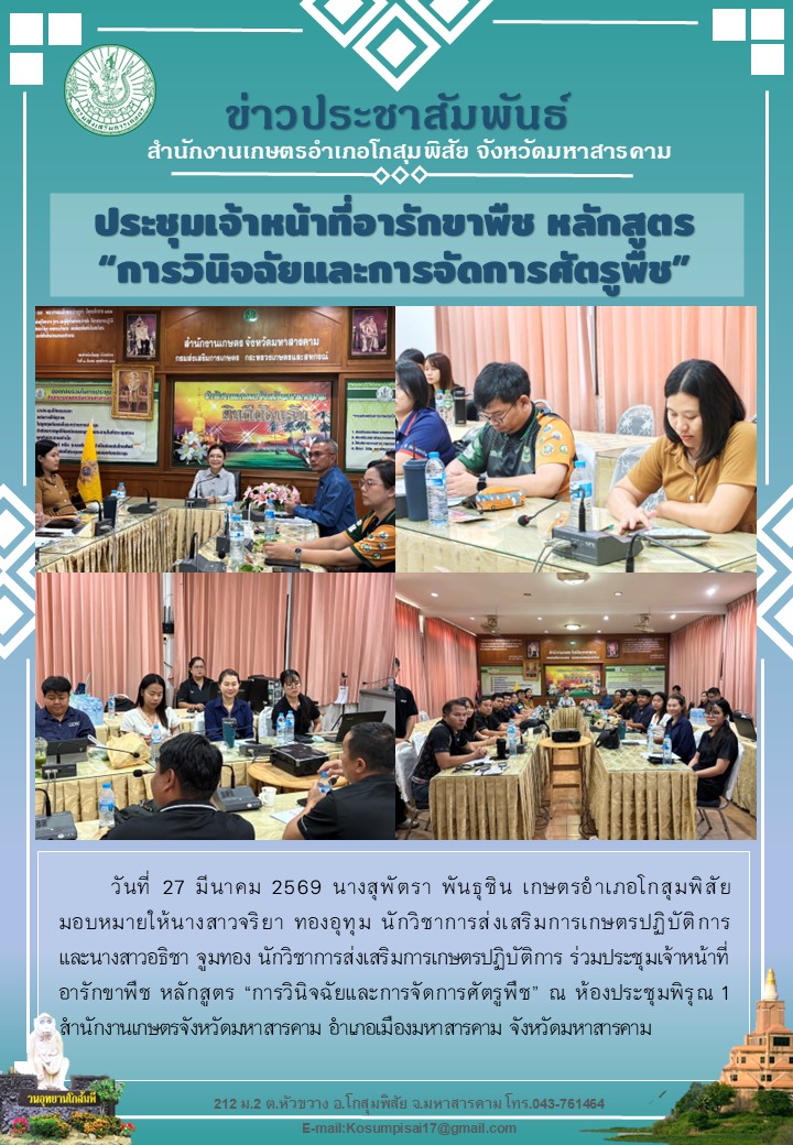 นางสุพัตรา เกษตรอำเภอโกสุมพิสัย มอบหมาย น.ส.จริยา และ น.ส.อธิชา นักวิชาการส่งเสริมการเกษตร เข้าร่วมประชุมเจ้าหน้าที่อารักขาพืช ณ ห้องประชุมพิรุณ 1By kosumphisai_admin / 27 มีนาคม 2026