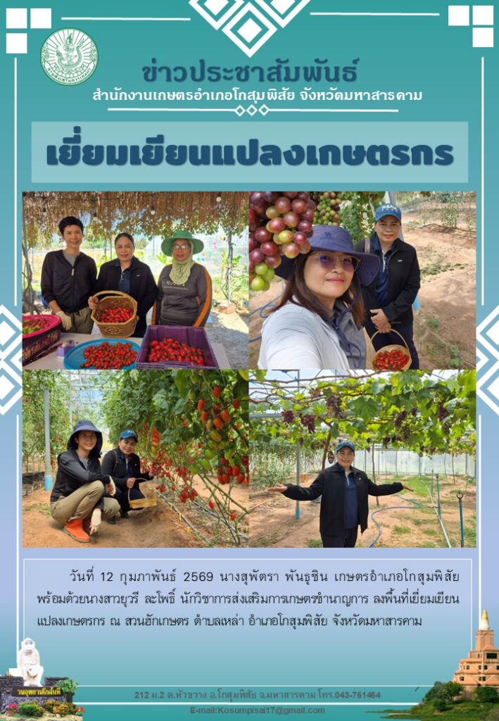 ข่าวส่งเสริมการเกษตรนางสาวกัญณฐา เกษตรจังหวัดมหาสารคาม ลงพื้นที่นิเทศงานร่วมกับ จนท. เกษตรอำเภอโกสุมพิสัย kosumphisai_admin / 16 กุมภาพันธ์ 2026