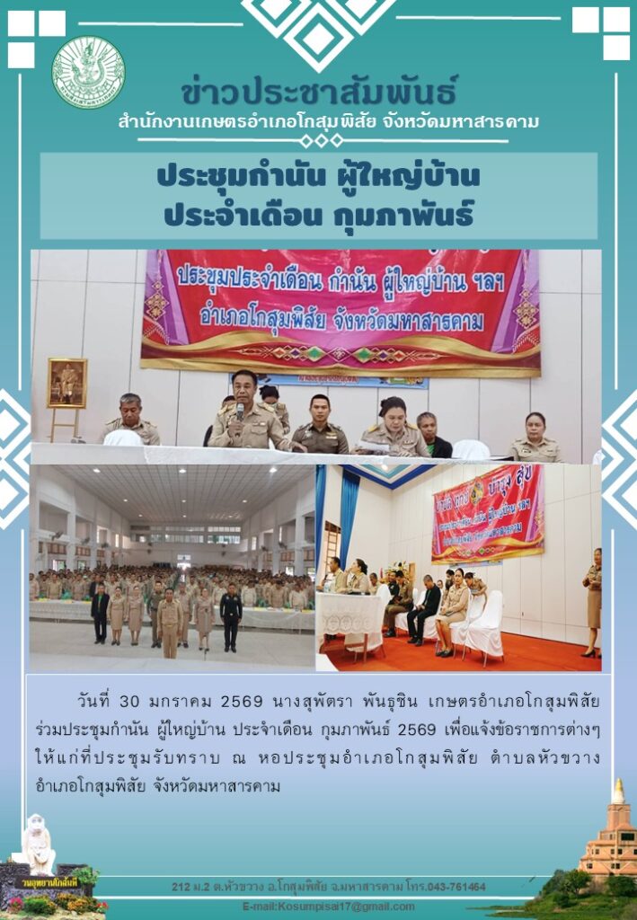 สุพัตรา พันธุชิน กษอ.โกสุมพิสัย ประชุมกำนัน ผู้ใหญ่บ้าน ประจำเดือน กุมภาพันธ์ 2569