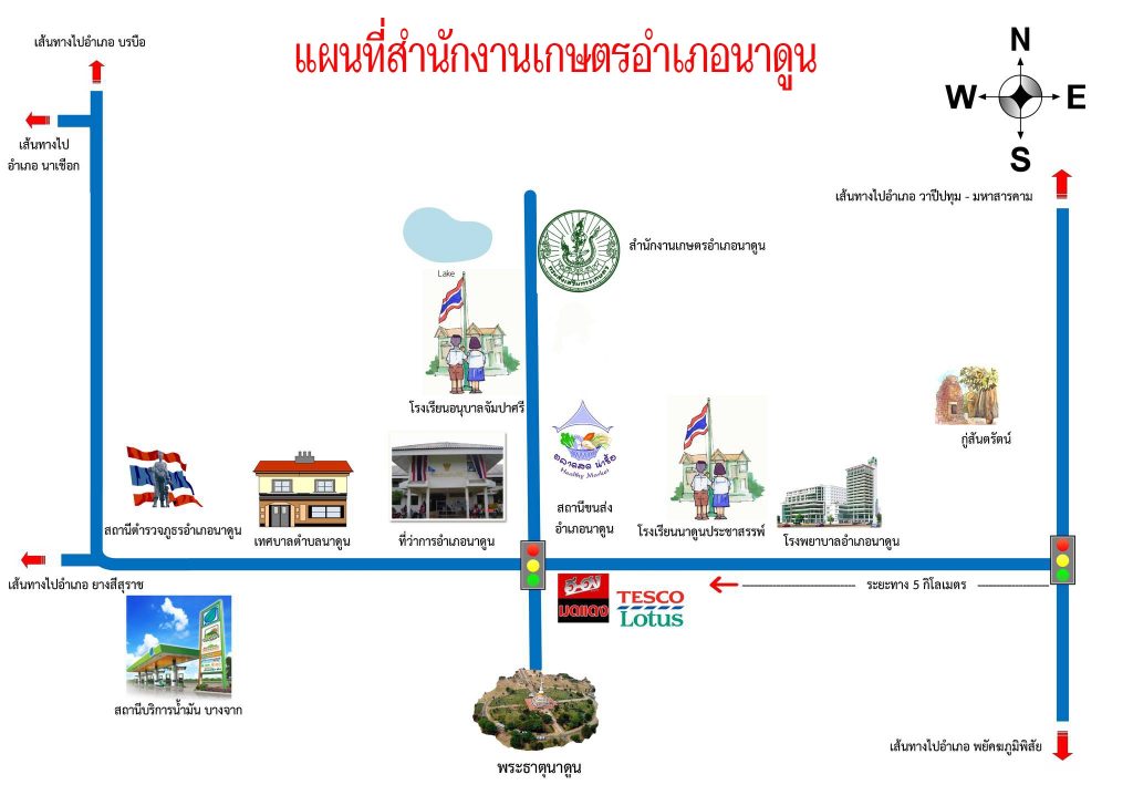 สำนักงานเกษตรอำเภอนาดูน ตั้งอยู่เลขที่ 125 หมู่ 9 บ้านจัมปาศรี ตำบลนาดูน อำเภอนาดูน จังหวัดมหาสารคาม 44180