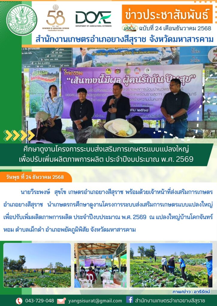 วันพุธ ที่ 24 ธันวาคม 2568 นายวีระพงษ์ สุขโข เกษตรอำเภอยางสีสุราช พร้อมด้วยเจ้าหน้าที่ส่งเสริมการเกษตรอำเภอยางสีสุราช นำเกษตรกรศึกษาดูงานโครงการระบบส่งเสริมการเกษตรแบบแปลงใหญ่เพื่อปรับเพิ่มผลิตภาพการผลิต ประจำปีงบประมาณ พ.ศ. 2569 ณ แปลงใหญ่บ้านโคกจันทร์หอม ตำบลเม็กดำ อำเภอพยัคภูมิพิสัย จังหวัดมหาสารคาม